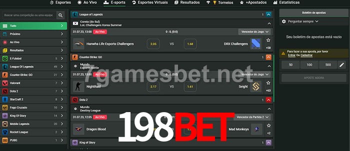 O 198Bet oferece uma grande seleção de opções de apostas em e-sports com probabilidades competitivas